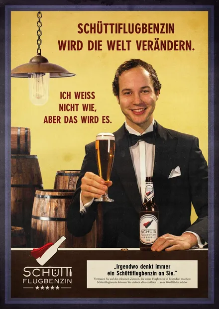 Die bewusst altmodische Gestaltung – mit klaren Linien, handgezimmerten Elementen und nostalgischer Farbpalette – macht die Plakate heute zu echten Kultobjekten im Schüttiflugbenzin-Kosmos. Sie stehen exemplarisch für den augenzwinkernden Umgang mit Werbemythen und Markenversprechen. Ein Blick zurück in eine Zeit, in der ein Getränk nicht einfach nur erfrischte – sondern gleich das ganze Lebensgefühl anhob.